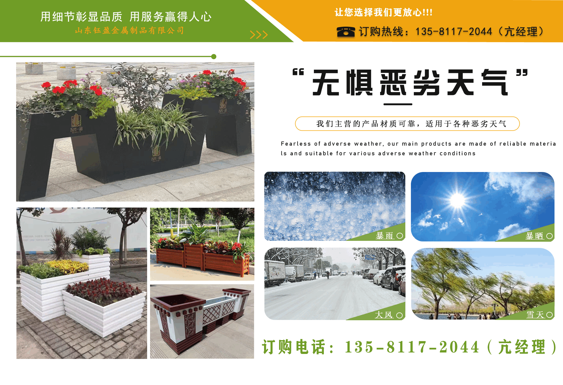 山東鈺盈金屬制品有限公司主營鍍鋅板花箱,道路隔斷花箱,定制花箱,戶外道路花箱,花箱座椅等產(chǎn)品,產(chǎn)品結(jié)構(gòu)合理、性能優(yōu)良,具有強度高、耐腐蝕、抗老化、隔熱隔音、節(jié)約能源、外形美觀、使用壽命長等優(yōu)點,深受國內(nèi)外客戶認可。 我們根據(jù)客戶所在城市的文化特征,制造出符合當?shù)爻鞘形幕瘹庀⒌淖匀涣Ⅲw、觀賞性強的花箱產(chǎn)品成為城市里一道靚麗的風景線。 公司實行誠實、公正、守信、價格合理、平等互利?! 」緫{借雄厚經(jīng)驗實力,恪守誠信為本的原則,得到了眾多客戶的信賴,并在業(yè)界獲得良好的口碑。建立了穩(wěn)固的合作關(guān)系,隨著業(yè)務(wù)的不斷發(fā)展和壯大,合作伙伴的范圍也在不斷擴大。我們熱情盼望與您的合作,為社會的可持續(xù)發(fā)展獻上一份努力。...
